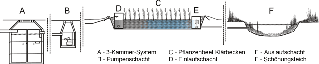 Stufen (Mech. Vorklärung A-B, Biol. Klärung C-E, Ablauf F): |